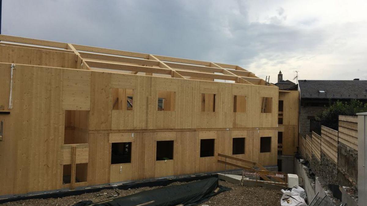 El projecte va començar fa dos anys, amb millores vàries, entre les quals destaquen el condicionament del solar contigu i la instal·lació de xarxes de serveis, amb la nova caldera que biomassa. Ara, els tècnics encarregats treballen en aquestes grans peces de fusta que formen l'estructura interior i exterior de l'edifici.